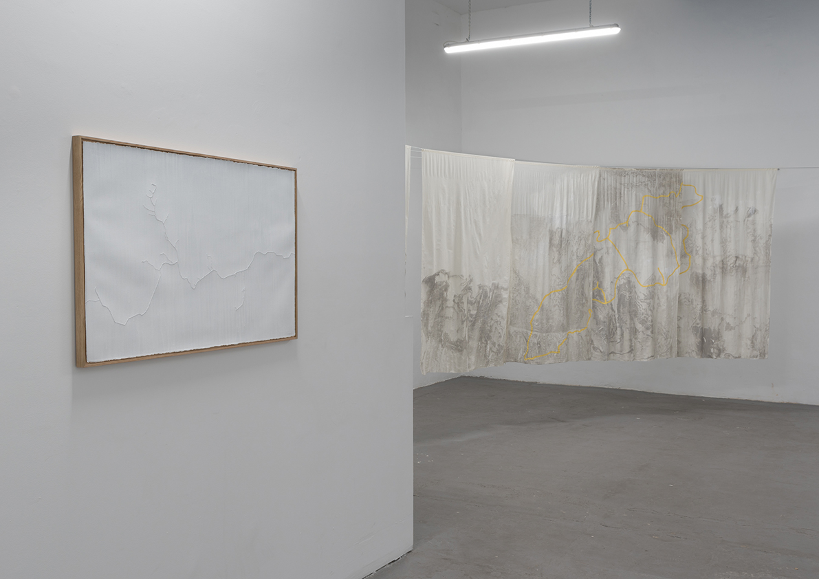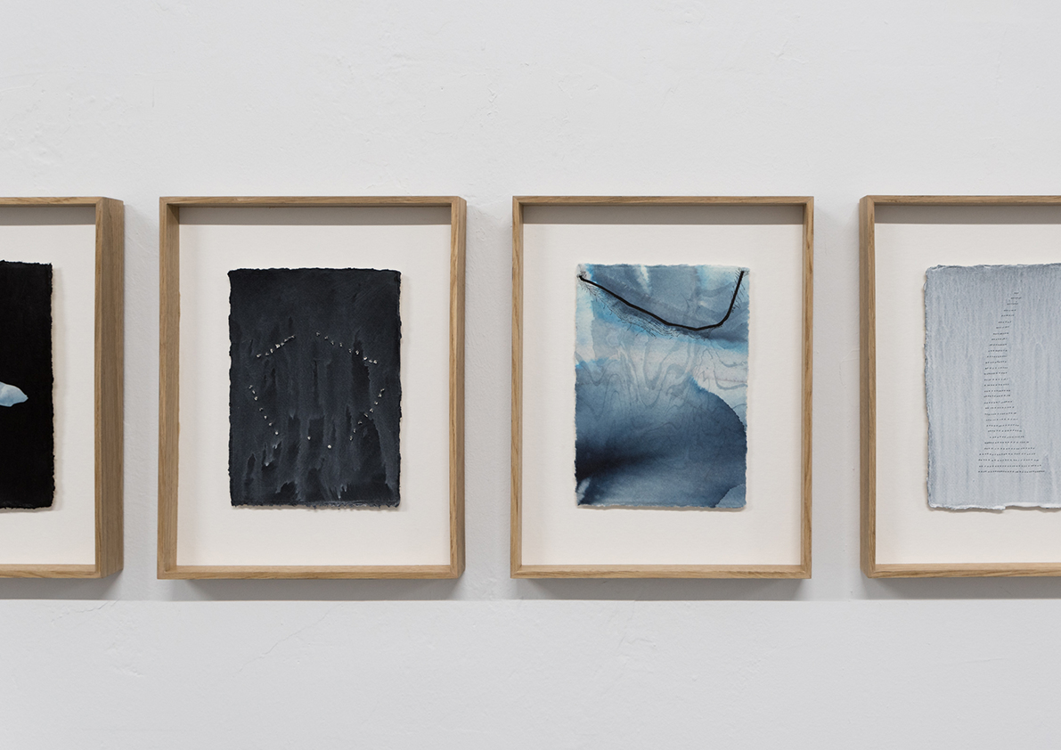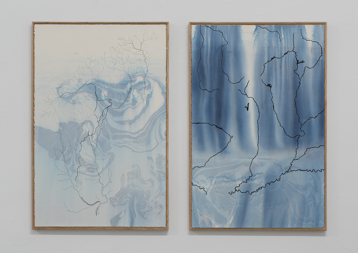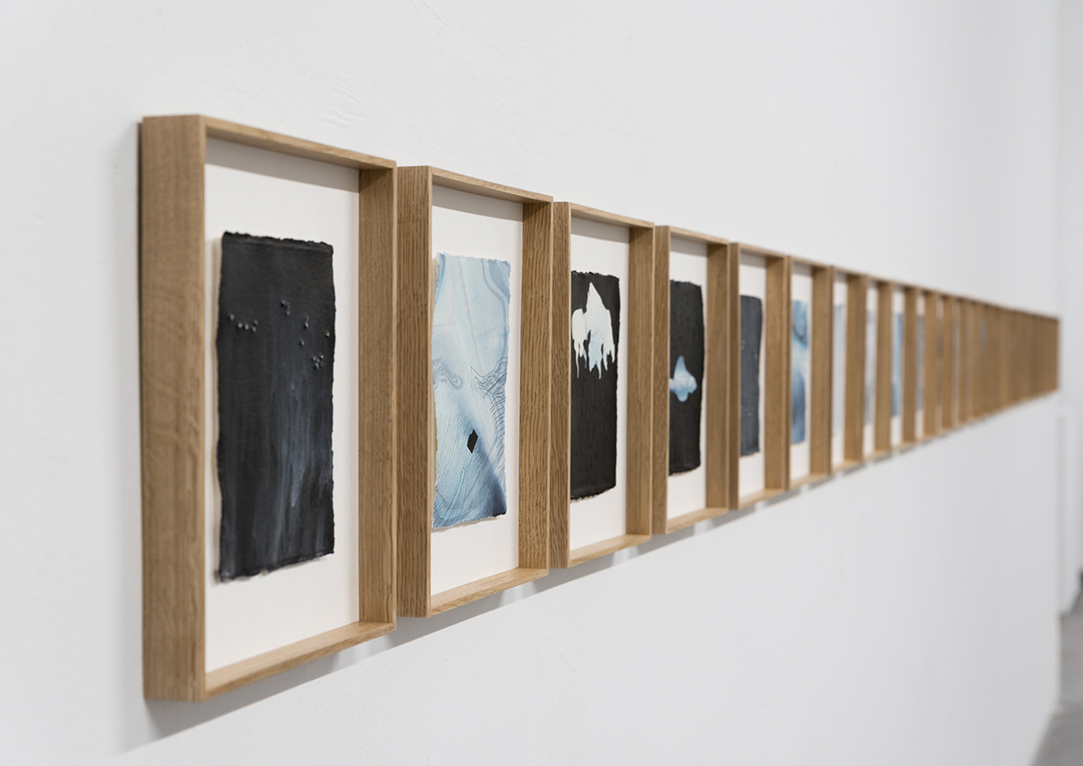 Each piece in this exhibition is a small work of engineering capable of containin water through refined techniques in a continuous and constant process. Together, they compose a cartography where fresh water guides the pigment and free water transforms paper into earth.